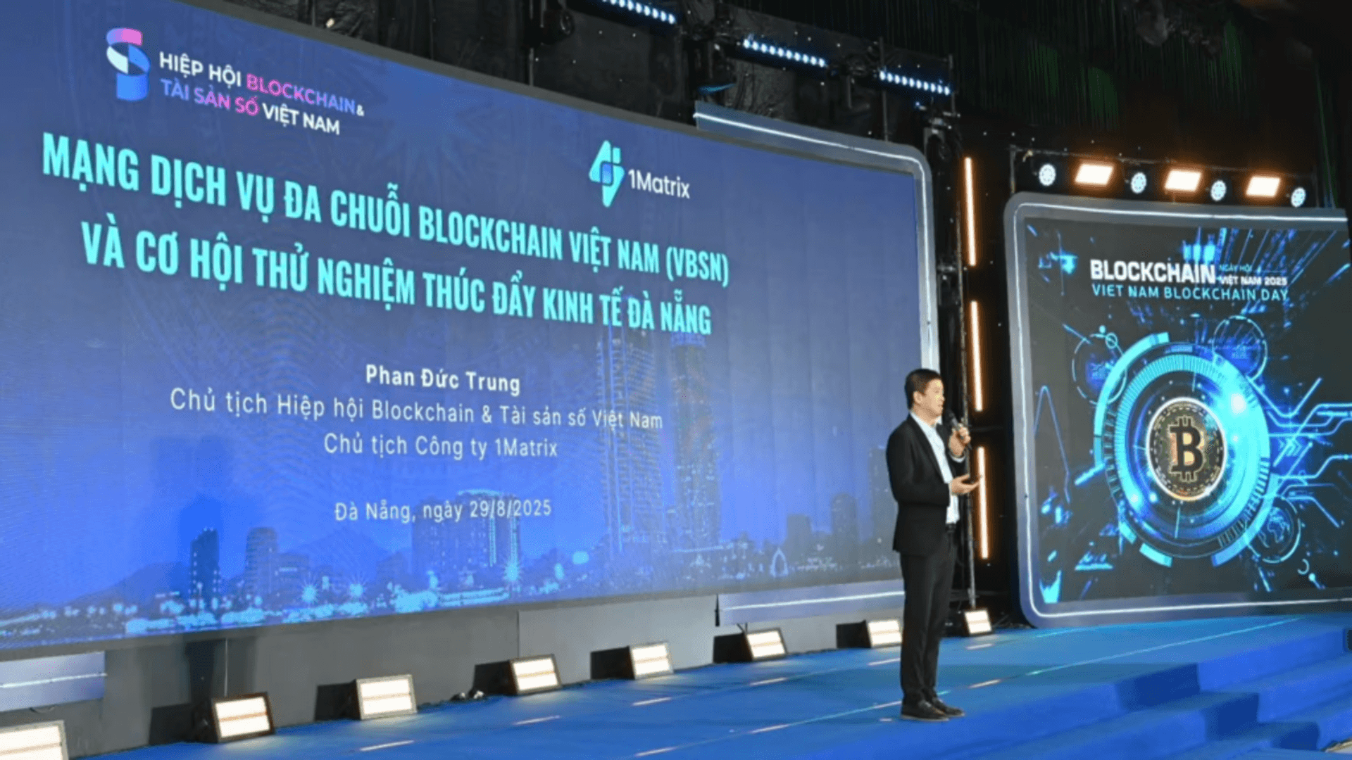 Ngày 29/8/2025, Ngày hội Blockchain Việt Nam 2025 đã diễn ra tại Đà Nẵng với sự tham gia của các lãnh đạo cấp cao UBND thành phố, Ban Chính sách – Chiến lược Trung ương, Ban Tuyên giáo và Dân vận Trung ương, Uỷ ban Kinh tế Quốc hội, Uỷ ban Chứng khoán Nhà nước... Tại sự kiện ông Phan Đức Trung, Chủ tịch Hiệp hội Blockchain và Tài sản số Việt Nam (VBA), Chủ tịch Công ty 1Matrix, đã chia sẻ về những kết quả bước đầu và tác động của Mạng Dịch vụ Đa chuỗi Blockchain Việt Nam (VBSN) đối với khu vực dịch vụ công – tư.